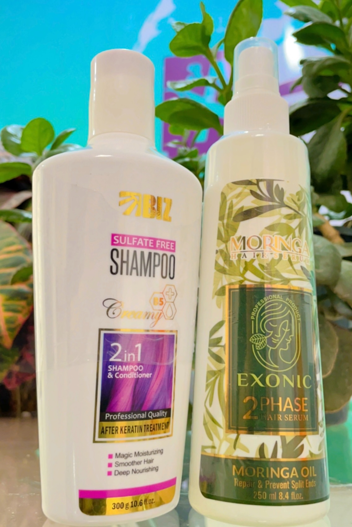 این پک شامل شامپو فری سولفات مخصوص موهای کراتینه شده و سرم دو فاز حاوی روغن آرگان بوده که در ادامه توضیحات هر محصول جداگانه ارائه می شود